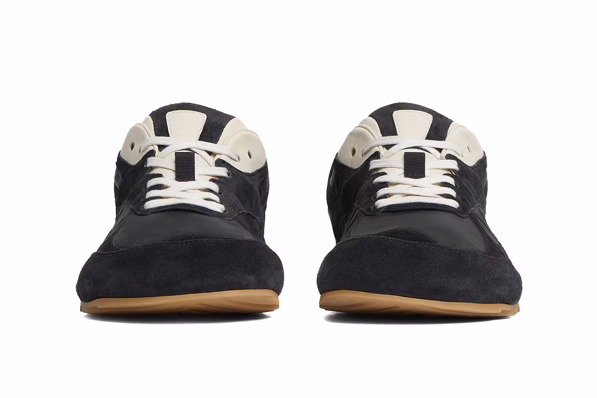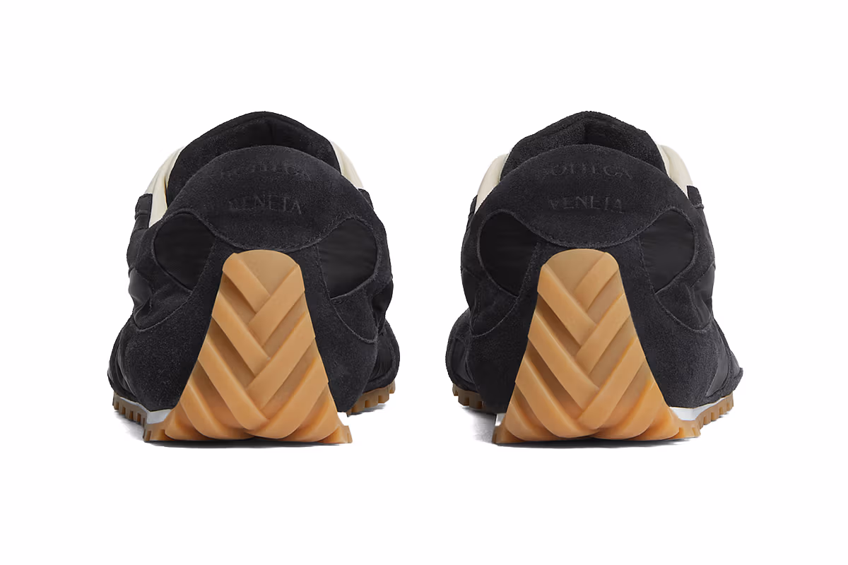 Materials are understated yet meticulously chosen. Lightweight nylon forms the base, soft suede overlays, while a lambskin lining and leather insole provide a second-skin feel, grounded by a durable rubber gumsole with heel tread and tonal Bottega Veneta engraving at the back.