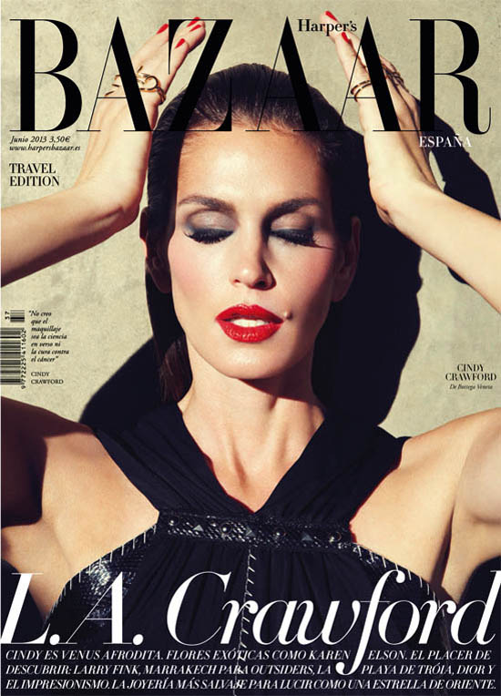 The always gorgeous top model Cindy Crawford graces the cover of Harper’s Bazaar Spain’s June Cover and travel edition cover. Photographed in Hollywood, California by Nagi Sakai, Crawford lounges and poses in Roberto Cavalli, Michael Kors and Vionnet all styled by fashion editor Juan Cebrian. Her hair was styled by Terry Millet with makeup from Billy B. Take a look at all the pictures below.