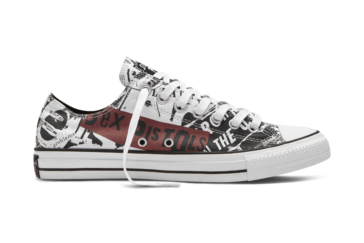 Iconic punk uniform accessory, the Converse Chuck Taylor is paying homage to legendary punk rockers, the Sex Pistols, for Spring 2016. The collection features colours, materials, and graphics inspired by the band’s iconic style and album art. The footwear collection features details such as stitch detailing and graphic overlays. Each style includes the iconic Sex Pistols logo on the tongue of the sneaker as well as in the foot bed.