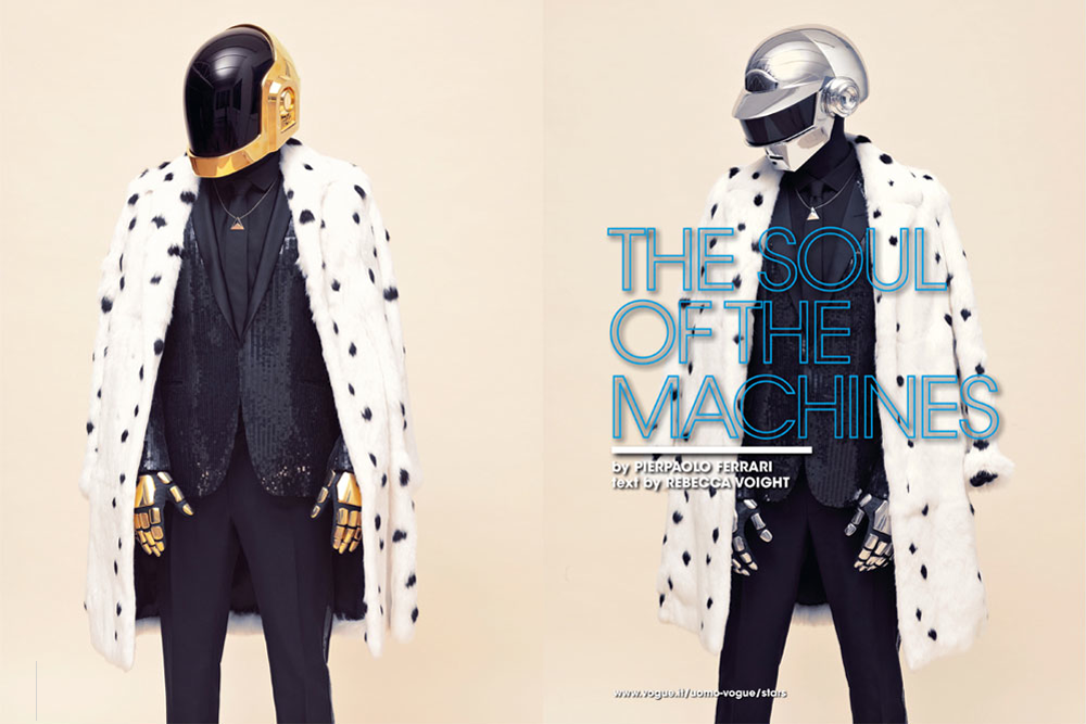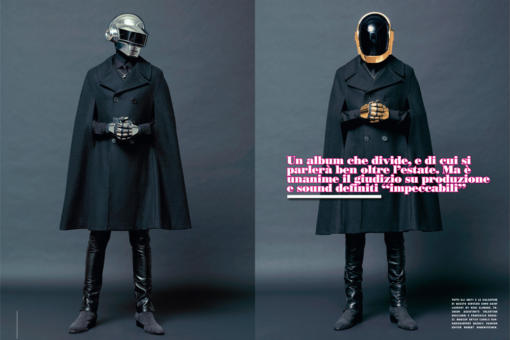 Electronic music-superstars Thomas Bangalter and Manuel de Homem-Christo, better known as Daft Punk grace the cover of the July/August issue of L’Uomo Vogue and are featured in an accompanying editorial. The French robot duo were photographed by Pierpaolo Ferrari wearing them most stylish outfits from what looks like the upcoming fall/winter season Saint Laurent collection. Take a look at the pictures below and read the full interview here.