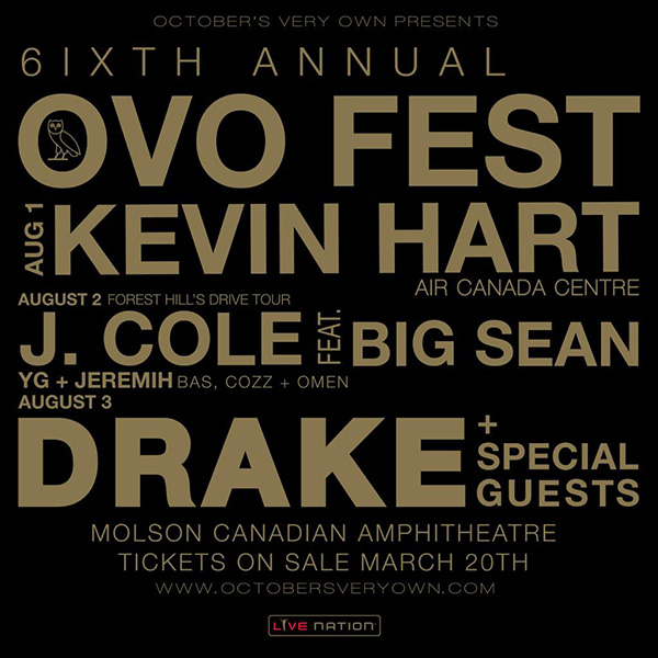 The weekend kicks off when Kevin Hart brings his “What Now?” comedy tour to the Air Canada Centre on Saturday August 1st. Following that J.Cole will bring his “Forest Hills Drive Tour” with Big Sean, YG Jeremih, and Dreamville artists Bas, Cozz, and Omen on Sunday August 2nd. Finally, Drake will headline the final day, Monday August 3, at the Molson Canadian Amphitheatre and will again feature a plethora of special guests. It’s going to be a banger, as always.