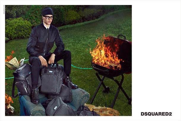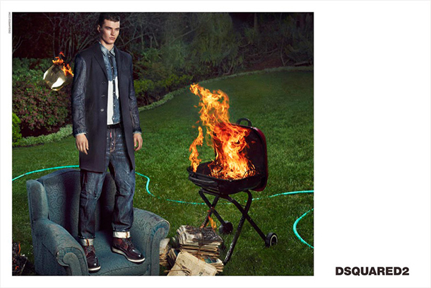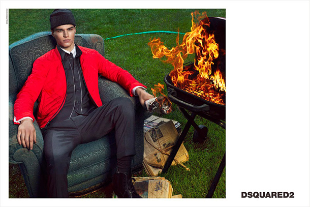 Canadian luxury brand Dsquared2 presents their Fall/Winter 2014 campaign featuring model Arran Sly. Photographed by Mert Alas & Marcus Piggott, Sly plays the role of a notorious criminal in the brands prison-theme collection designed by brothers Dan and Dean Caten. There is a clever juxtaposition in the campaign between the fantastic clothing and oddly out of place setting.
