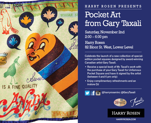This fall, Harry Rosen introduces a new collection of five special-edition pocket squares designed by Canadian artist Gary Taxali. Celebrating the culturally rich heritage of Canada and featured cities – Toronto, Montreal, Calgary and Vancouver, each of Taxali’s unique designs plays off of the character, culture and landmarks of each city. The result is a colourful and comical, yet highly wearable, collector’s item.