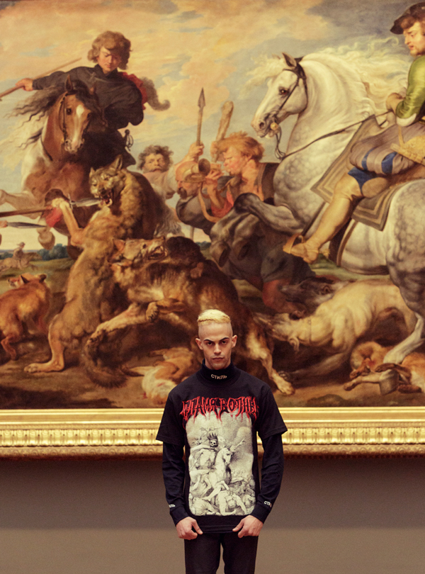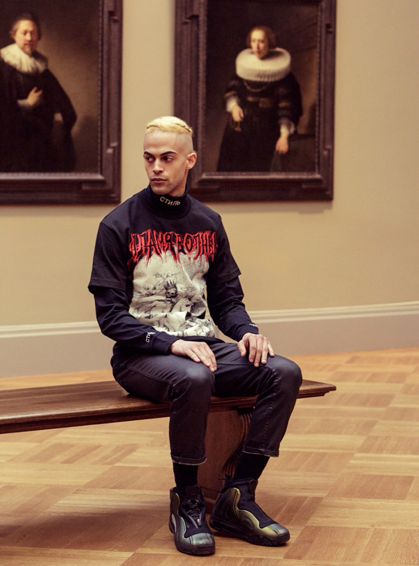 Designer, artist, DJ, and all around cool guy Heron Preston has teamed up with photographer Nick Knight’s SHOWstudio on a pretty badass new project. The collabo comes in the form of bootleg T-shirt number three from Preston, who drew inspiration from death metal. The shirt features a combination of the Russian words for “flame” and “wave” and over a 1775 painting by English artist John Hamilton Mortimer called Death on a Pale Horse. The shirt comes in two pieces, a tee and a turtle neck which can be worn individually or together. You can purchase yours while supplies last at SHOWstudio now.