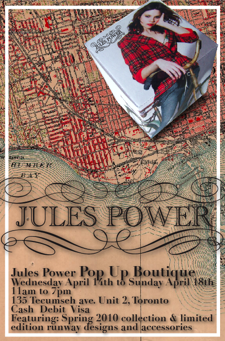 The lovely Jules Power wrote to us today with this special invite for all you Sidewalk Hustle readers! After a fabulously successful show at Toronto Fashion Week, Power is set to open up a pop up shop for a brief four days at 135 Tecumseh Ave! Be there!