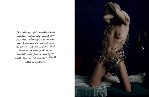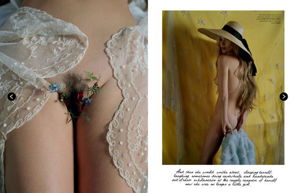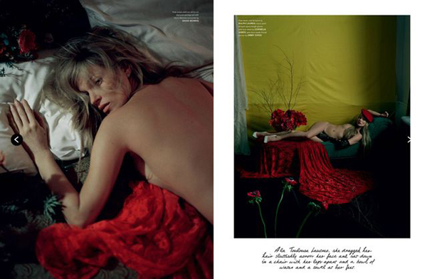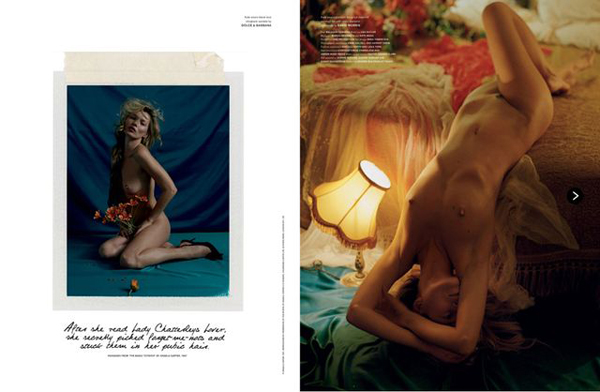 For the Spring/Summer 2013 issue of LOVE Magazine, top model Kate Moss bares all for photographer Tim Walker. Styled by Katie Grand, the British model wears next to nothing save for a few flowers, which don’t cover up much but rather seem to add just the right hint of colour against her pale naked skin. Take a look at the stunning shoot below, and remember, this is not safe for work.