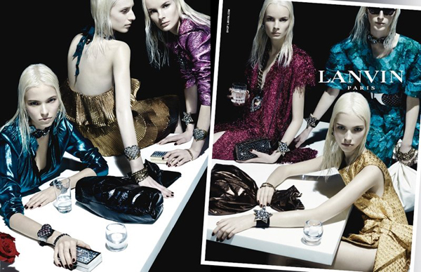 French luxury brand Lanvin presents their Spring/Summer 2014 Campaign photographed by Steven Meisel. Featuring models Alexandre Faye, Jeremy Matos looking like dashing gentlemen and Julia Nobis, Laurie Harding and Sasha Luss as sulking icy blondes. Alber Elbaz vision is colourful with glittering brocade and lamé (metallic) designs. Take a look below.