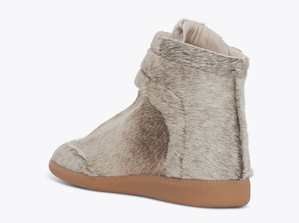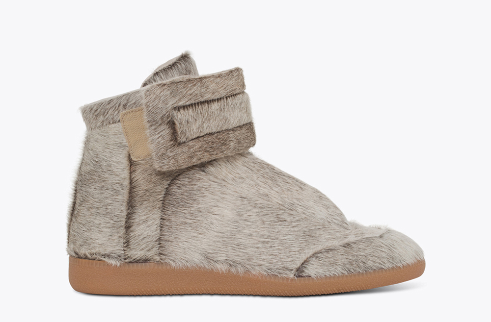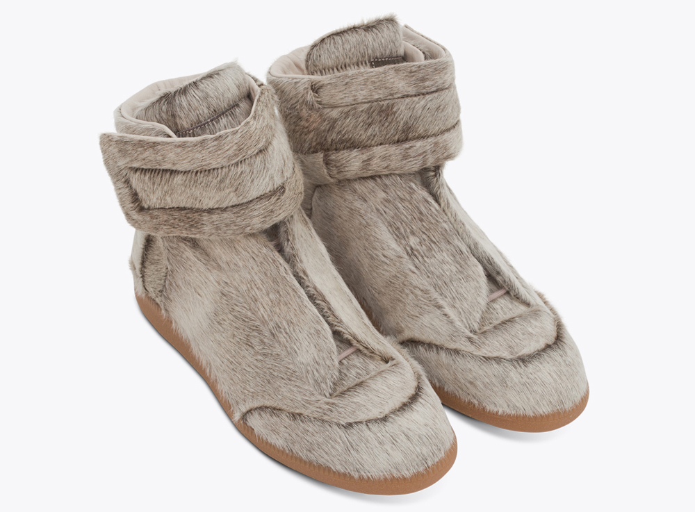 Luxury fashion house, Maison Martin Margiela has released their Kanye West Yeezus tour sneaker. Originally made exclusively for the outspoken rapper to wear throughout the Yeezus Tour and festival dates. The sneaker is an ankle-strapped high-top covered in pony hair with a chunky velcro strap top closure, hidden rounded laces, lined with leather and featuring tonal stitching and a contrasting rubber sole. The Italian-made Yeezus model is available now for roughly $975 USD at select retailers.
