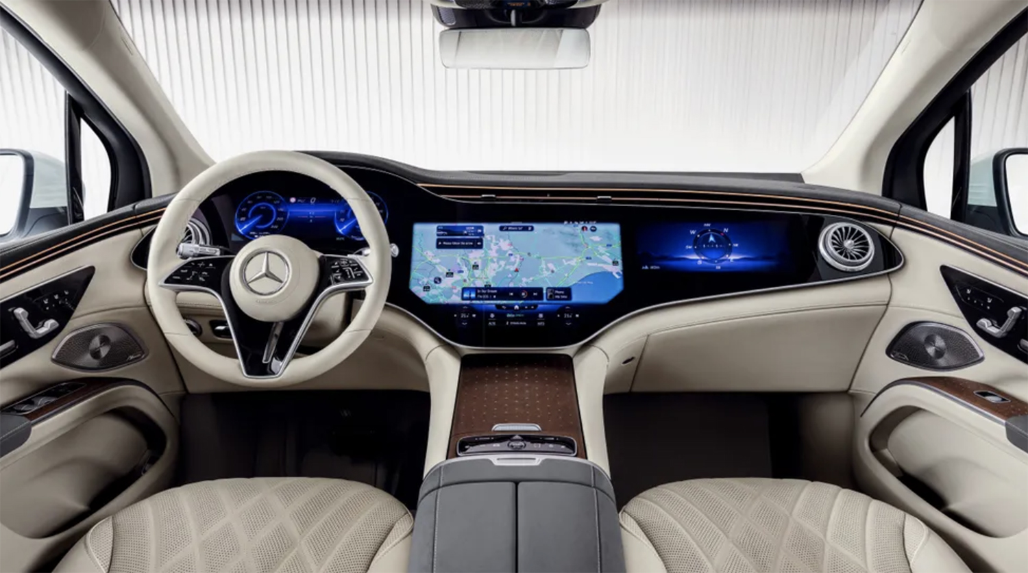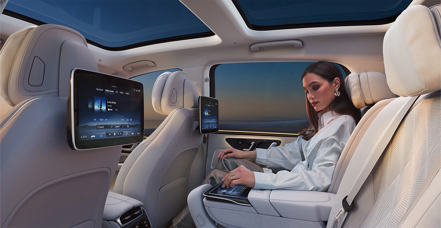 The EQS SUV’s interior features extra headroom, seven seats, and the new 56-inch Hyperscreen dashboard that stretches from door to door. This is definitely some sci-fi-type stuff right here. Say goodbye to physical buttons, nobs, and gauges, as there is also a 17.7-inch touchscreen primarily for infotainment functions and a 12.3-inch touchscreen for the passenger. With dedicated screens and touchpads in the backseats, you’re going to need some blue light block glasses! The EQS SUV will also come standard with wireless Apple CarPlay and Android Auto, a Burmester audio system, and wireless charging.