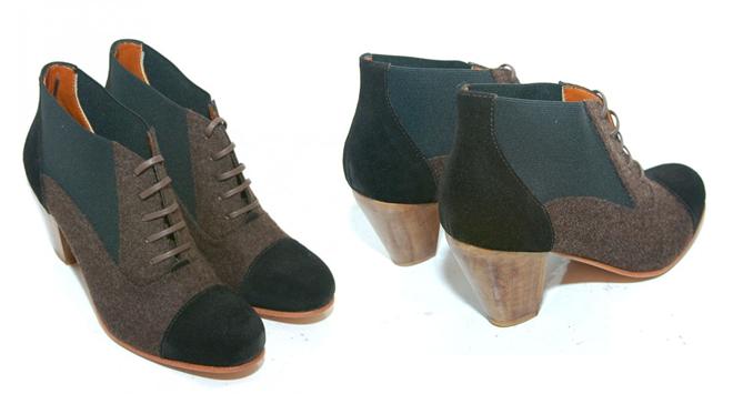 Detailed to absolute perfection, these boots featuring a suede toe, wool body, stretchy black side panels and a three inch wooden heel, and cost $338 US online at Gargyle.