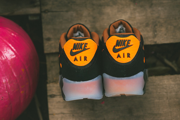 To celebrate Halloween, Nike presents their Air Max 90 Ice release , presented in a “Halloween” colourway. Taking colour ques from autumn foliage with tones of orange, beige, and vermillion across the paneled upper, juxtaposed with a black cracked leather base layer, and a translucent light blue outsole that glows in the dark. These limited edition sneakers are available now via Sneaker Politics.