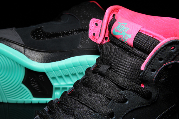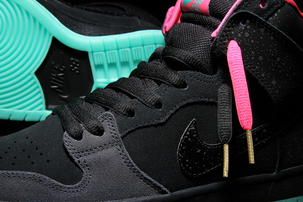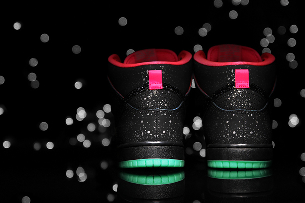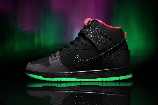 Nike skateboarding has teamed up with Michigan-based retailer Premier for a pretty cool collaborative Dunk sneaker, the “Northern Lights.” The almost all black Dunk High Pro features pink highlights along the upper and a glow-in-the-dark green sole and reflective ‘starlight’ patterning throughout the Swoosh and heel counter. The Dunk High Pro “Northern Lights” drops November 29 on Premier’s online shop. Take a closer look at the below.