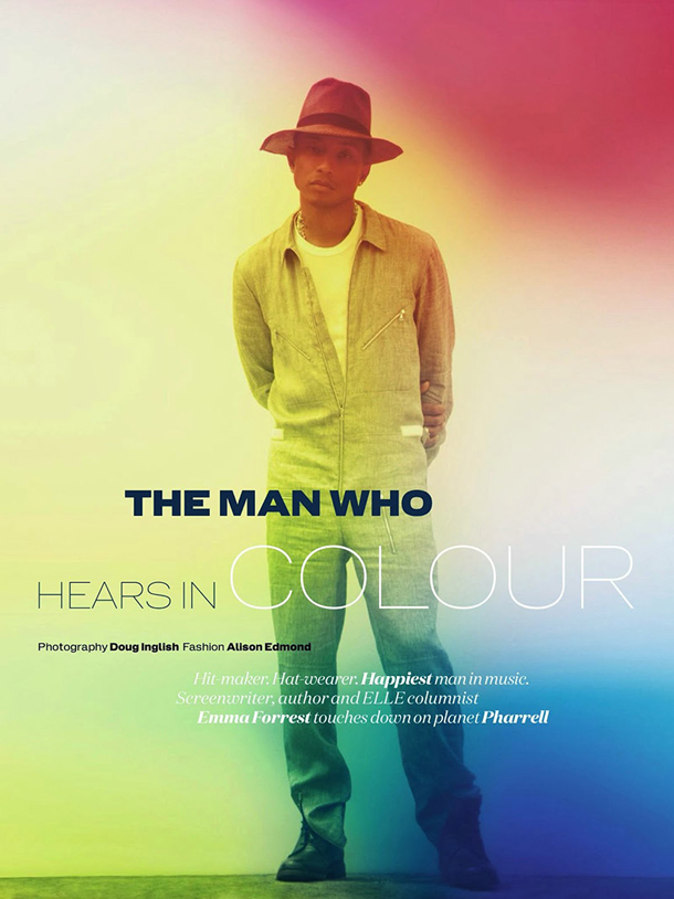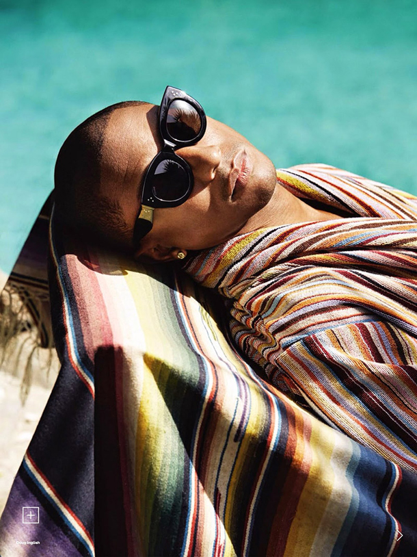 Pharrell Williams poses for Elle UK’s July 2014 issue, photographed by Doug Inglish and outfitted by Alison Edmond. The editorial is titled ‘The Man Who Hears in Colour’ and has the multi-talented “Get Lucky” singer rocking a First Nations headdress on the cover. Normally this would be culturally insensitive and maybe it still is, but lets remember the cover art of N.E.R.D.’s fourth album Nothing which also had Pharrell rocking a similar head-piece. In addition to the headdress, Pharrell also rocks the Vivienne Westwood Buffalo. Take a look through the pictures below.