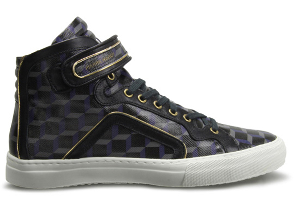 Incredible! I am so head over heels in love with the Pierre Hardy “cube” design, oh my gawd!!! Check out the brand new “Black Cube” high top sneaker from the Pierre Hardy Fall/Winter 2010 Collection. This lovely and heart stealing sneaker comes in a black/midnight blue/grey colourway with gold accents, a white outersole and ankle strap. The sneaker is available now.