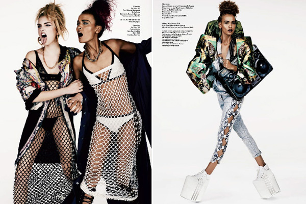 V Magazine pay’s homage to the ghetto fabulous 90’s Salt-N-Pepa style in this editorial featuring Lily Donaldson and Liya Kebede. Push It Real Good proves that every fad eventually comes back around, i.e. ghetto gold heart hoop earrings, crimped hair, and freakishly high platform sneakers!