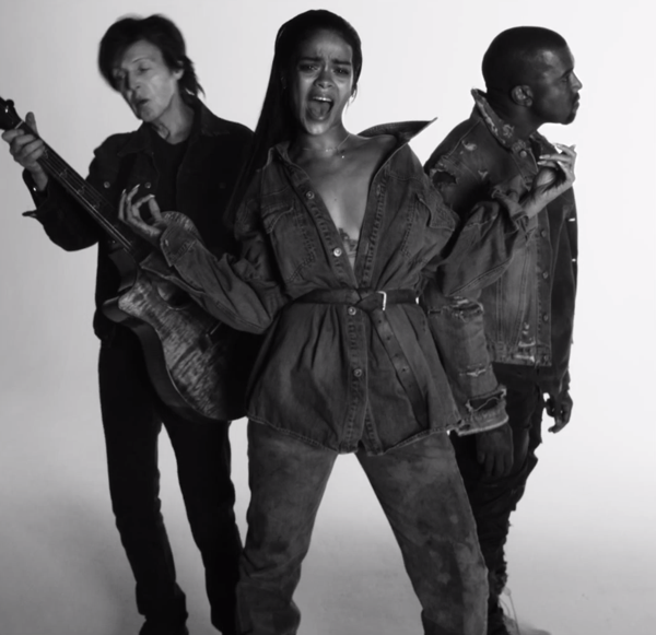 Badgirl Rihanna has dropped the video for her new single “FourFiveSeconds”, featuring are veritable who’s who have the top musical talents in the world, Sir Paul McCartney and Kanye West. The three mega-stars, appear in the Inez van Lamsweerde and Vinoodh Matadin directed, black and white video, rocking so much denim. Also, are those the new adidas Yeezi’s Kanye and Rihanna are wearing? Oh dang!