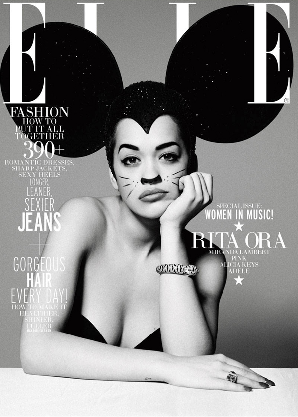 Roc Nation singer Rita Ora graces the cover of ELLE magazine’s annual “Women in Music” issue. Dressed up in Mickey Mouse ears, Chanel Haute Couture, Dior Haute Couture, Valentino, and Calvin Klein all the while looking fantastic. In the issue, Ora talks about her music, the Spice Girls, and Jay-Z.