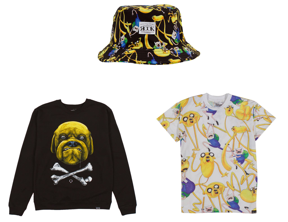 ROOK Brand has partnered with Cartoon Network to present a limited edition ROOK Brand x Adventure Time Collection based on the popular animated series Adventure Time with Finn & Jake. The one-of-a-kind collection showcases original artwork by ROOK co-owner and creative director Joe King, featuring the beloved characters Finn and Jake. The three-item collection will include graphics by King in ROOK’s signature hand-drawn style displayed across an all-over tee (The Adventure Time Tee), crew neck fleece (Jake Fleece), and bucket hat (Adventure Time Bucket). A special preview set that includes all three items packaged inside an exclusive tote bag will be available for purchase at the opening night reception of the Adventure Time art show taking place at 1988 Gallery on April 3, 2014 from 7-10pm, and through the duration of the show, before being release to retailers in Fall 2014.