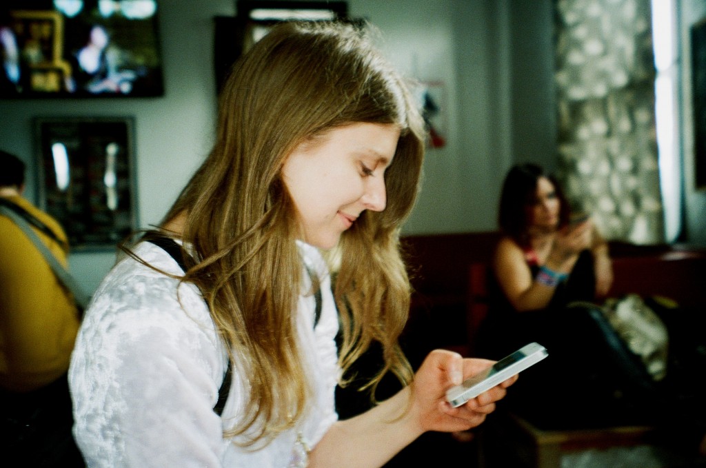 Backstage after her Pitchfork showcase set, Lydia Ainsworth takes a small break to check her phone.