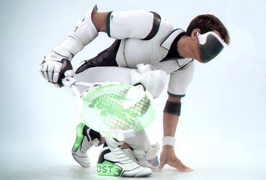 This is a bit old on the jump off… two years to be exactly, sorry, but my buddy linked me this awesome video/article from DVICE about the “Future of Tennis: Imagined by Lacoste” in honor of their 75 anniversary and it was pretty off the hook. The envisioned future of tennis is super cool with stylish vibrant footwear with heel screens that read “Lacoste,” body armor, and a fancy collapsible racquet with the Lacoste alligator logo. Honestly this video is INSANE, I must insist you all watch it, and lets all keep out fingers crossed that the future of sports ends up actualizing into this.