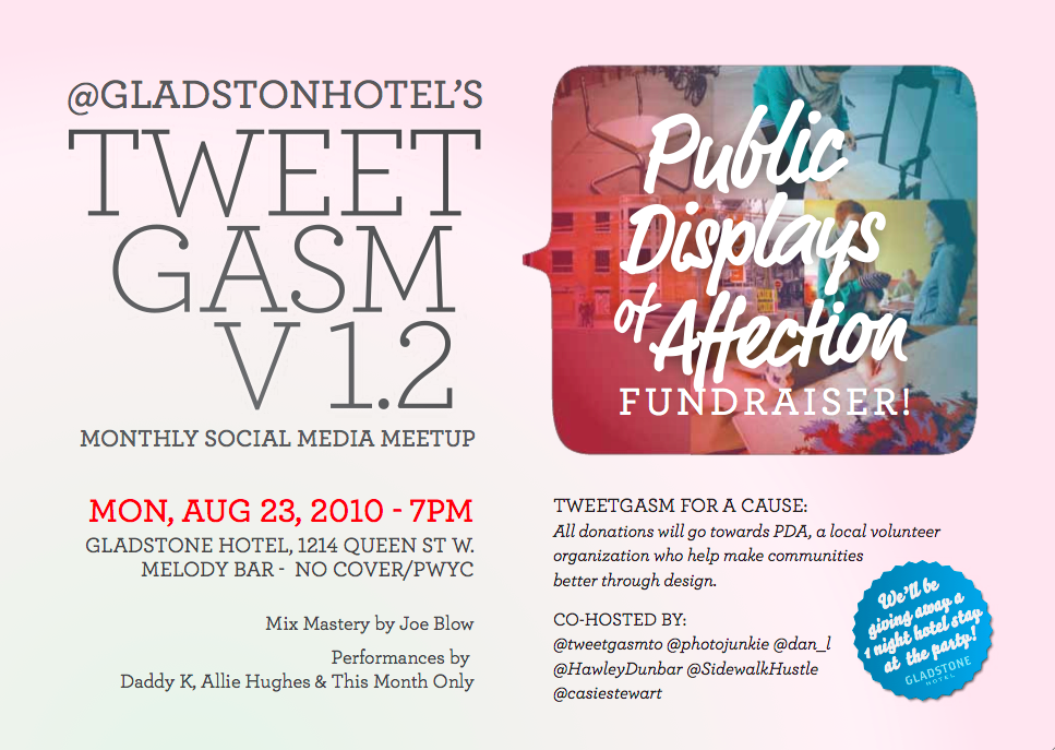 Dearest readers and followers, we’d love you to join us tomorrow evening at The Gladstone Hotel for Toronto’s sexiest social media meet-up appropriately named, Tweetgasm V 1.2 co-hosted by yours truly, Sidewalk Hustle (@sidewalkhustle & @HawleyDunbar).