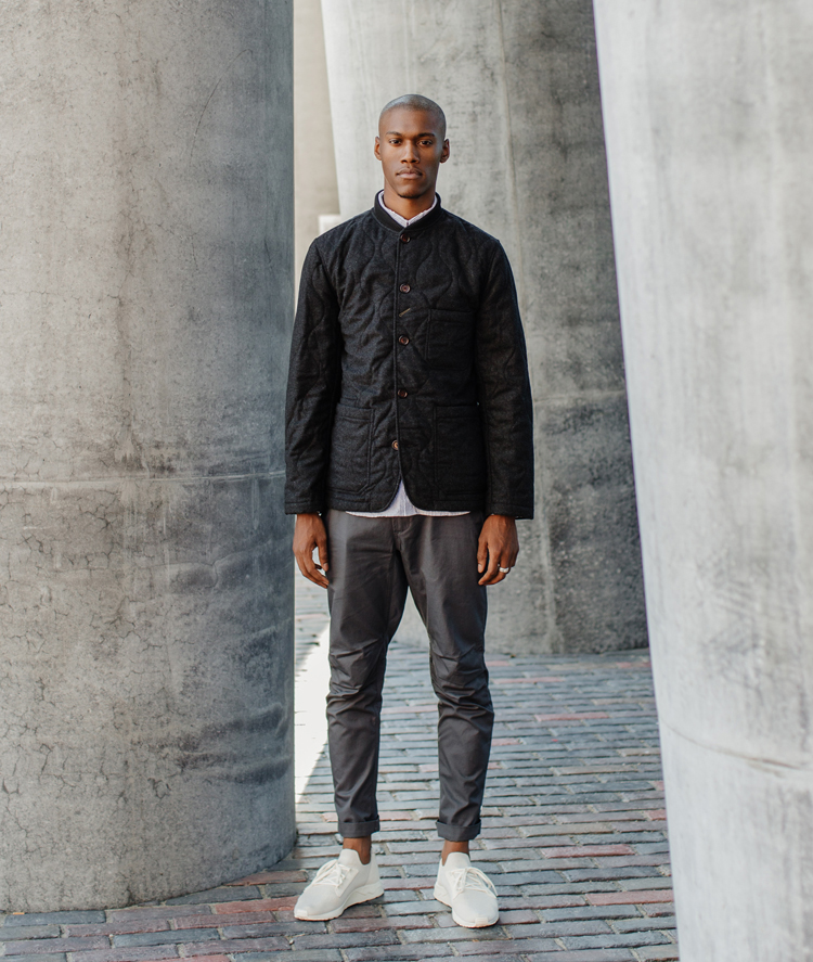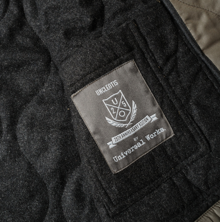 Lastly, we get the Universal Works Jacket. David Keyte, Universal Works co-founder, and designer, has worked alongside Uncle Otis to craft two exclusive jackets with custom charcoal wool exterior and quilted olive nylon liner and reversed. Designed with a varsity neckline, the jacket is the perfect fall wear weight or layering piece in the winter.